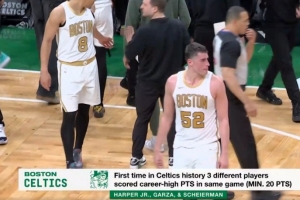 此役,小哈珀得到27分、加尔扎得到27分、谢尔曼得到30分,皆为个人生涯新高。
