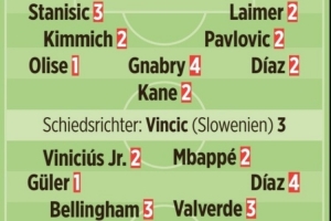 拜仁首发:诺伊尔5分、斯坦尼西奇3分、于帕梅卡诺1分、若纳坦·塔3分、莱默尔2分、基米希2分、帕夫洛维奇2分、奥利塞1分、格纳布里4分、路易斯·迪亚斯2分、凯恩2分